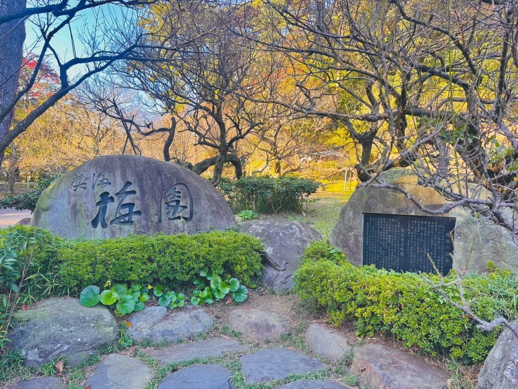 温暖な気候のおかげで、早咲きの梅が11月中旬ごろから咲き始めることもあり、赤や朱に染まる紅葉と白や淡紅色の梅の花が同時に楽しめることもあるらしいです。