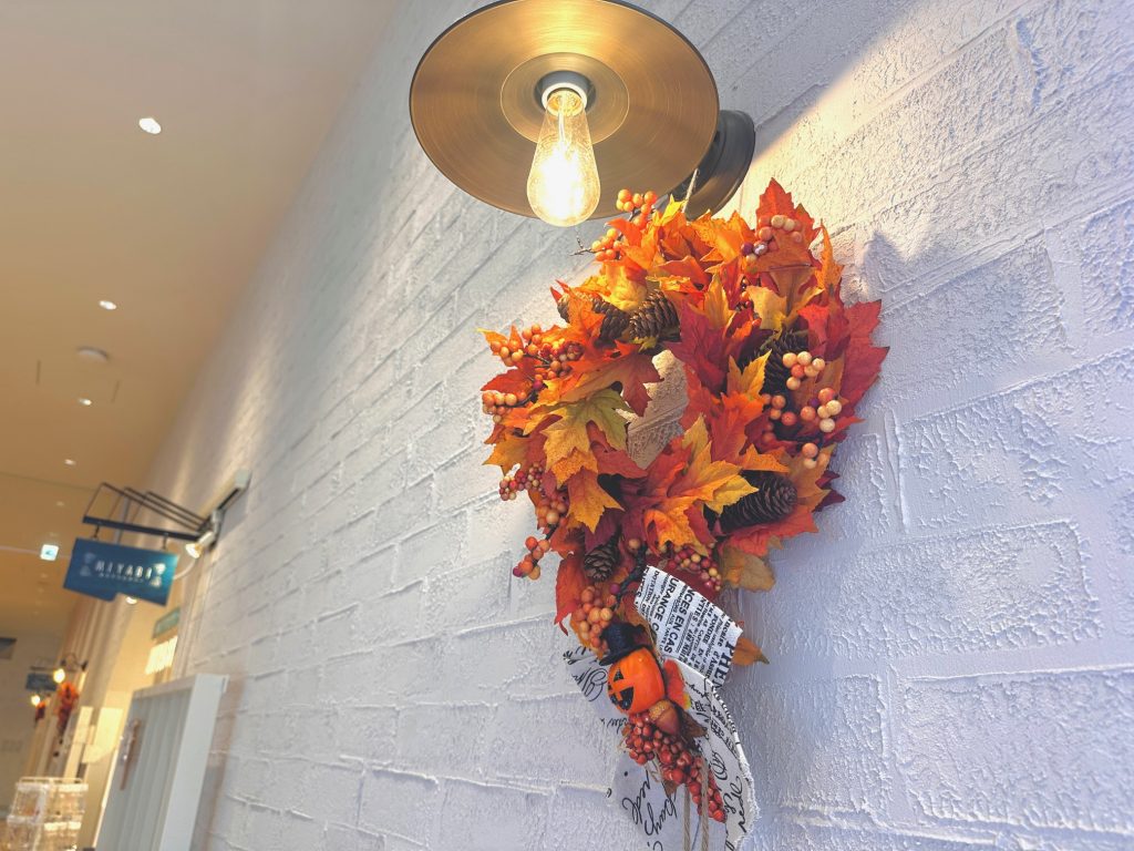 他にもAQUA SQUAREに向かう外通路の途中にあるATAMIモニュメントも秋らしく装飾されていたり、AQUA SQUARE2階のお土産コーナー「ラ・伊豆 マルシェ」横の通路にある照明にハロウィンリースが吊り下げられていたりなど、各所に装飾が散りばめられています!