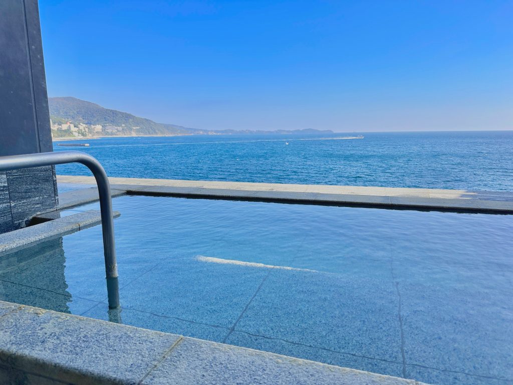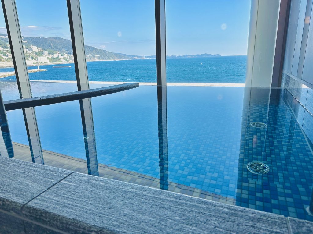 立ったままゆったりと浸かるこの湯船では、熱海の街並みから相模灘の水平線までを一望!