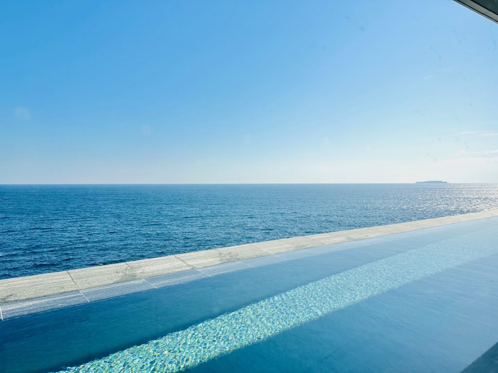 立ち湯なので深さが110cmあり、湯船の縁と海面が視覚的につながるような、まるで海と一体になったかのような浮遊感を味わえます!